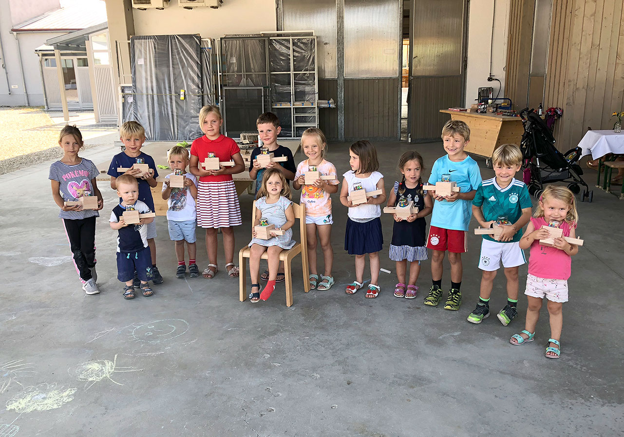 Aber natürlich gehört weiterhin die Handwerkskunst zu einer Schreinerei, und so konnten die Kinder unter Anleitung von Doris Friedberger und Andreas Oberhofer anschließend selbst Hand anlegen: Ergebnis war jeweils ein selbstgefertigter Smarties-Spender, natürlich aus dem nachwachsenden Werkstoff Holz. Bei einem Buffet ließen die Kinder und ihre Eltern den Familiennachmittag bei der Schreinerei Oberhofer ausklingen.
